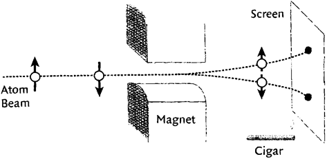게를라흐가 이룬 결과는 끝났지만, 시가는 없었다! 그 흔적들은 슈테른이 그의 손에 평판들을 쥐고 슈테른의 황화 숨결 담배 연기가 스며들 수 있을 정도로 충분한 거리를 두고 그것들을 연구할 때 나타났다. 그것은 어렴풋하다가, 이윽고 눈으로 볼 수 있을 정도가 되었으며, 은 흔적들이 짙은 검정색의 황화 흔적을 남겼다.[49] 이 역사적인 실험의 마술과 같은 성공은 흔하고 값싼 (시가) 비결에 달려 있었다(그림 15). 만약 슈테른의 흡연 습관이 그의 상대적인 빈곤과 짝을 이루지 않았다면, 이 두 사람은 공간 양자화의 어떤 흔적을 발견하리라는 희망을 접었을 것이다. 즉 그러한 실험은 시가의 황 연기로부터 끄집어 낸 작은 도움이 없으므로 그 자체로 발견되지 못했을 것이다.[50]