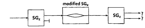 모든 것은 중앙에 놓인 SGx 장비없이도 그저 좋은 것으로 보인다(두 개의 SGz 장비들이 이어져 있는 이전의 실험을 보라). 하지만 무언가 SGx 장비를 우리가 포함할 때 잘못되어 버린 것으로 보인다. 그것은 마치 SGx 장비가 z-방향에서의 두 번째 스핀 측정을 ‘망쳐 버리기’ 위해 어떤 것을 행했던 것처럼 보인다. 우리는 이 결과를 어떻게 이해할 수 있나? x-방향에서의 스핀값의 측정은 z-방향에서의 입자의 스핀값을 다소 방해했던 것인가?