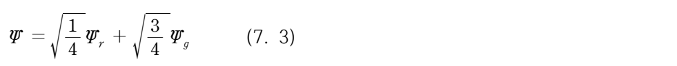 몇 가지 예들을 생각해 보자. 우리가 입자의 몇몇 속성을 측정하길 원한다고 해 보자. 이 속성을 ‘색’이라 부르자. 그리고 만약 매번 <256>우리가 입자의 색을 측정하면, 어떤 입자에서도 우리는 두 가지 가능한 값들, 즉 ‘빨강’ 또는 ‘초록’ 중 하나를 얻는다고 해 보자. 이런 종류의 체계 – 속성이 측정되는 하나(즉 색)는 두 가지 가능한 값들 중 하나를 취할 수 있다 – 는 두-상태 체계라고 불리워진다. (만약 N개의 가은한 값들이 있다면, 그것은 N-상태 체계일 것이다.) 두-상태 체계는 두 가지 특정 해를 가지는데, 이는 또한 고유함수(eigenfunctions) 또는 고유상태(eigenstates)라고 불린다(eigen은 특성을 지칭하는 독일어다). 우리는 한 고유상태는 Ψr, 다른 고유상태는 Ψg라고 부를 것이다. 만약 우리가 고유함수 Ψr의 ‘색’이라고 불리워지는 속성을 측정한다면, 그 대답은 ‘빨강’이라는 것을 발견하며, 이와 대응해서 우리가 Ψg의 속성을 측정하면, 우리는 그 대답이 ‘초록’이라는 것을 발견할 것이다. 측정값 ‘초록’와 ‘빨강’은 상응하는 고유값(eigenvalues)으로 불리워진다. SE의 선형성은 Ψr와 Ψg의 어떤 임의적인 선형적 조합이 마찬가지로 해라는 것을 의미한다. 즉 그것 또한 어떤 물리적으로 허용되는 상태인 것이다. 우리는 이러한 중첩을 다음과 같이 표현할 수 있다.