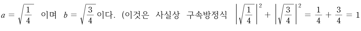 이것은 |a|2 + |b|2 = 1라는 요건을 충족시키는 무수한 중첩들 중의 하나이며, 이런 경우,