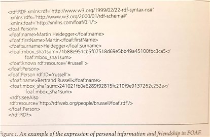 인간은 항상 인공적이고 자연적인 대상들에 둘러싸인 잡종적 환경 안에서 살아 왔다. 인공적인 것과 자연적인 것은 두 개의 분리된 영역이 아니며, 더군다나 인공적인 대상이 단순히 자연을 정복하기 위한 도구인 것만도 아니다. 이와 달리 인공적 대상들은 인간적 경험과 실존을 조건짓는 역동적 체계를 구성하는 것이다. 그리고 정확히 말해 인공적인 것이 끊임없이 더 큰 구체성을 향해 전개되고 있다는 바로 그 이유로 인해, 그것의 특유한 역사적 조건에 대한 지속적인 성찰이 요구되는 것이다. 우리가 살고 있는 환경(milieu)도 역시 변화해 왔다. 비디오테이프는 유투브 비디오에 의해 대체되었으며, 저녁 초대는 더 이상 편지를 통해 전달되지 않는다. 전화 사용은 거의 사라지고, 이메일도 마찬가지다. 하지만 페이스북 행사초대 기능은 더 많이 사용된다. 이러한 대상들은 기본적으로 데이터이고, 공유가능하며, 통제가능하다. 그것들은 가시적이건 비가시적이건 간에 시스템의 환경설정(configuration)을 통해 만들어질 수 있다. 이 책은 이런 디지털 대상들에 대한 연구작업을 수행하자고 제안한다. 독자는 이미 디지털 대상이 무엇인지에 대한 여러가지 생각들을 가지고 있을 것이다. 예를 들면 버그, 바이러스, 하드웨어 구성물, 가젯, 한 조각의 코드, 한 묶음의 바이너리 수들과 같은 것이 그것이다. 연구를 보다 집중적으로 하기 위해, 나는 이 책의 범위를 데이터에 한정할 것이다. 나는 디지털 대상이라는 말을 컴퓨터 스크린 위에 모양을 갖춰 있거나, 프로그램의 후단부(back end)19)에 숨겨져 있는 대상이란 뜻으로 사용한다. 이것은 구조와 도식에 따라 규제되는 데이터와 메타데이터로 구성된다. 메타데이터는 말그대로 데이터에 대한 데이터다. 도식은 메타데이터에 의미론적이고 기능적인 의미화를 부여한다. 또한 전산처리과정에서 이것들은 온톨로지라고 불리운다. 이 단어는 즉각 철학과 연관된다. 이어지는 그림1은 아주 단순한 디지털 대상을 보여주는데(하이데거에 관한 조각의 접속 정보contact information), 여기서 우리는 하이데거라는 사람(버틀란트 러셀을 아는 누군가로)을 기술하는 메타데이터를 나타낸다. 이 메타데이터는 FOAF(Friend of a Friend)라고 불리는 웹 온톨로지를 사용하여 도식화된 것이다.